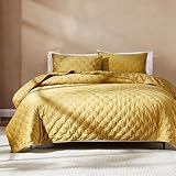 Lush Decor – Quilt Set, 3-Piece Cozy Velvet Bedding with Matching Shams, Embroidered Stitch Design (Haven Mineral Yellow, Full/Queen)