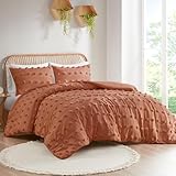 Intelligent Design Queen Duvet Cover Set, Clipped Jacquard Duvet Set Chic Pompoms Accent, All Seasons Lightweight Microfiber Bed Cover for Comforter with 2 Shams, Lucy, Full/Queen Rust 3 Piece