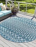 Unique Loom Outdoor Trellis Collection Area Rug – Tribal Trellis (10′ Round Teal/Ivory)