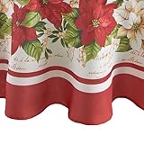 Elrene Home Fashions Red and White Poinsettia Holiday Fabric Wrinkle Resistant Tablecloth, 70″ Round, Multi