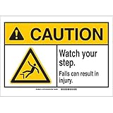 Brady 144776 Aluminum “Caution Watch Your Step Falls can Result in Injury” Sign, 7″ Height x 10″ Width, Black/Yellow on White
