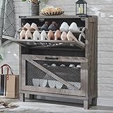 JXQTLINGMU Shoe Cabinet with 2 Flip Drawers, Farmhouse Shoe Storage Cabinet with Mesh Doors and Adjustable Shelves, Rustic Wooden Shoe Organizer, Small Shoe Cabinet Storage for Entryway, Grey