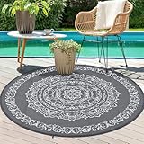 GarveeHome Round Outdoor Rug 6×6 Reversible Portable Plastic Straw Camping Rugs Waterproof Mat Outdoor Rug for RV Patio, Backyard, Deck, Picnic, Beach, Trailer, Grey/White(Medallion)