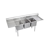 Elkay Foodservice 3 Compartment Sink, 106″X29.75″ OA, 36″ Working Height, 18X24 Bowl, 12 Deep, 10.75″ Backsplash, Left & Right 24″ Drainboards, 8″ On Center Faucet Hole, Galvinized Legs, Adjustable Feet, 16 Gauge 300 Series Stainless Steel, NSF Certified