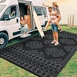 GarveeHome Outdoor Rug 8 x 10 Large Geometric Plastic Straw Rug, Waterproof Reversible Woven Carpet, UV-Resistant Camping Rug, Outside Patio Rug for Picnic, Balcony, Deck, Backyard, Black Gray