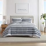 Nautica – Full/Queen Comforter Set, Textured Printed Cotton Slub Bedding with Matching Shams, Medium-Weight, Oeko-Tex Certified (Coastline Stripe Blue)