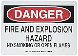 Brady 128127 No Smoking Sign, Legend “Fire and Explosion Hazard No Smoking Or Open Flames”, 10″ Height, 14″ Width, Black and Red on White